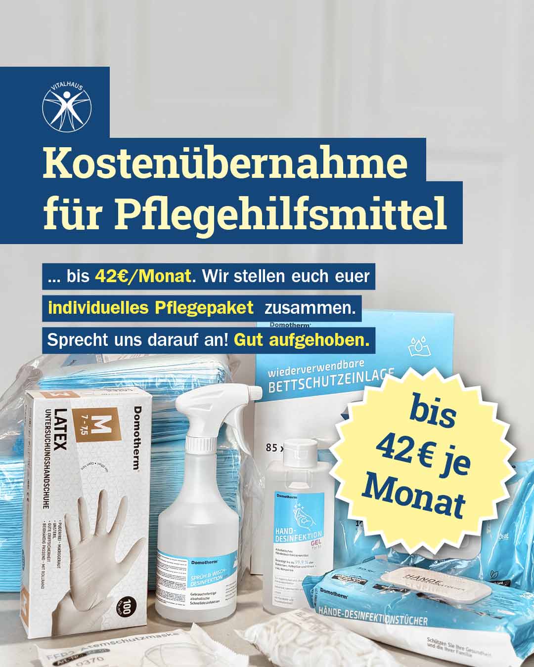 Dann kann eine Kostenübernahme von bis zu 42 € pro Monat (für Pflegehilfsmittel) erfolgen. Hierzu muss bei der Pflegekasse ein Antrag auf Kostenerstattung eingereicht werden.